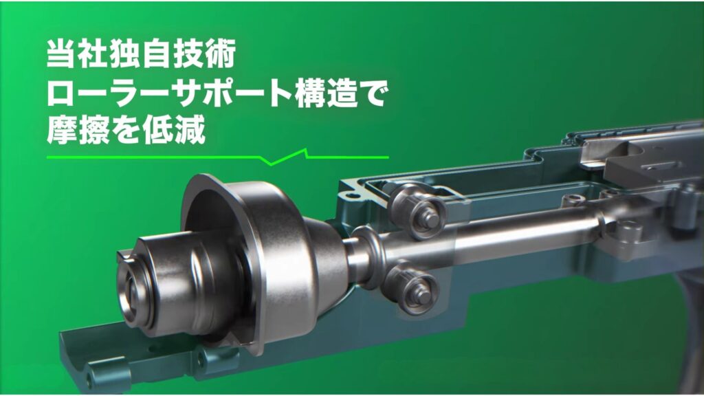 ローラーサポート構造とは、ブレードを差し込む先端の軸受け部分にベアリングを使用した構造のことであり、従来の焼結メタルを使用した金属すり合わせ方式よりも格段に摩耗や発熱を抑えられるため、製品の劣化を防ぐメリットがあります。