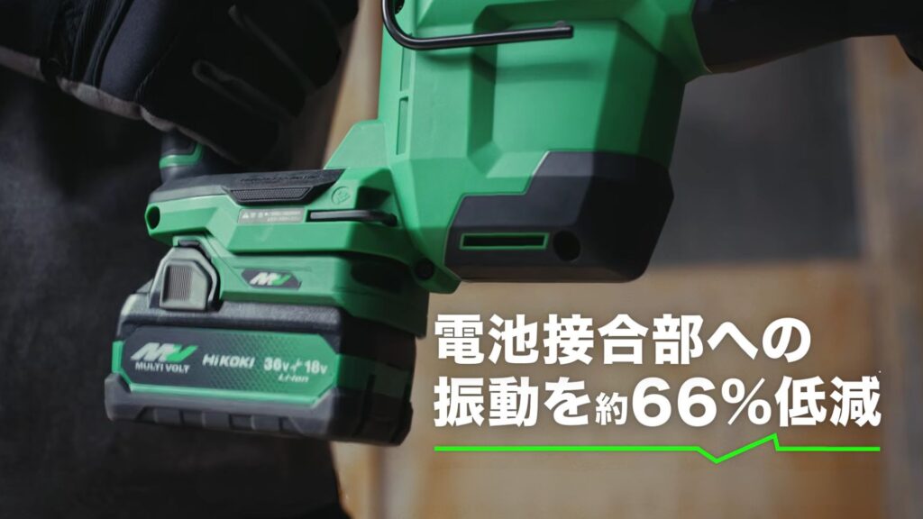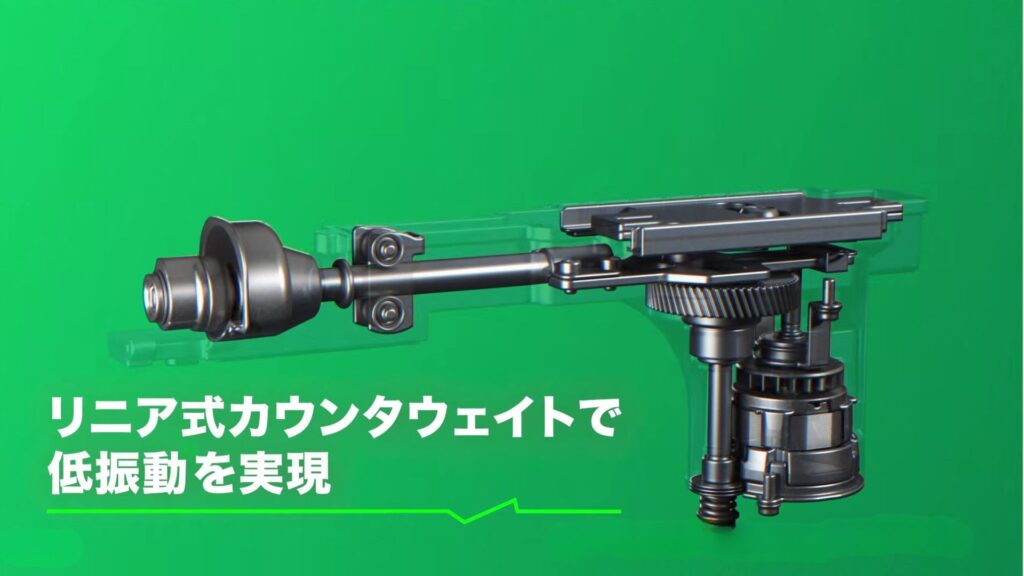 HiKOKI独自のローラーサポート構造で、先端の軸受け部分の耐久力が上がり、連続作業や長時間作業にも耐えられる強度を実現。また、リニア式カウンタウェイトにより、2つの軸が互いに逆方向へ作用するため、反動を抑えることができ、作業者の負担軽減できる製品となります。