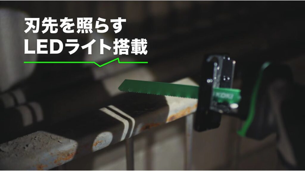 暗い作業場でも刃先を明るく照らすLEDライト搭載です。