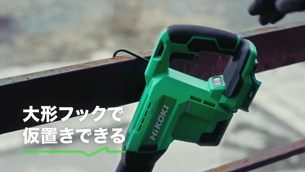 作業の休憩時には、大型フックで引っ掛けて固定することができます。