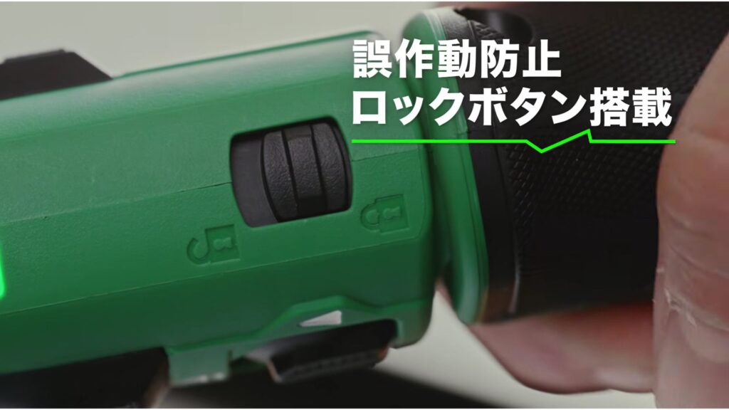 ペン型インパクトドライバーの課題として、腰袋に入れているときの誤作動がありましたが、WH3DAには、本体上部にロックボタンが搭載されているため、誤作動の心配がありません。