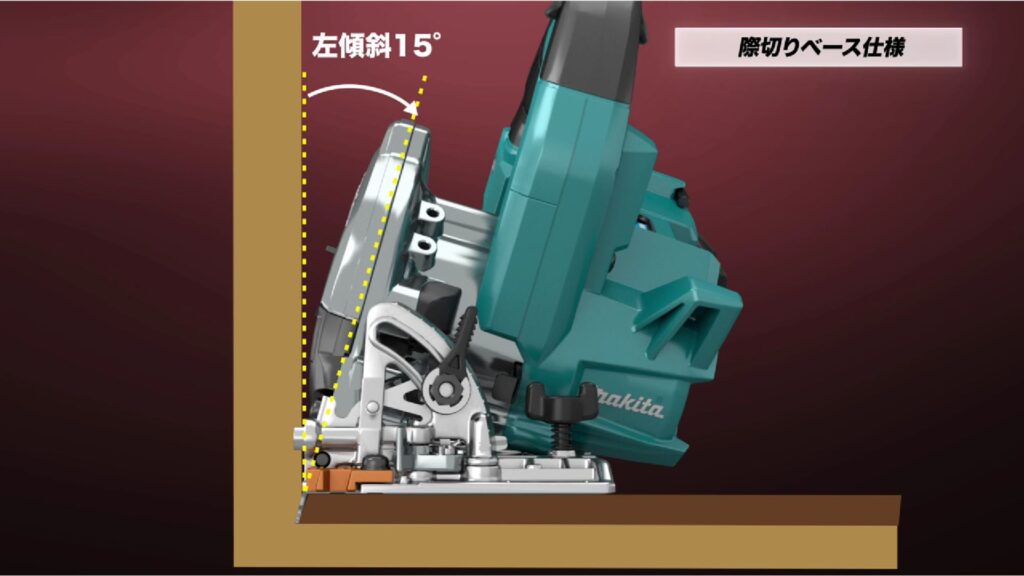 通常のマルノコではベースが壁にあたり際を切ることができないですが、際切り機能付きのマルノコは、一部ベースを外すことによって壁際ぎりぎりまで刃を持ってくることが可能です。
