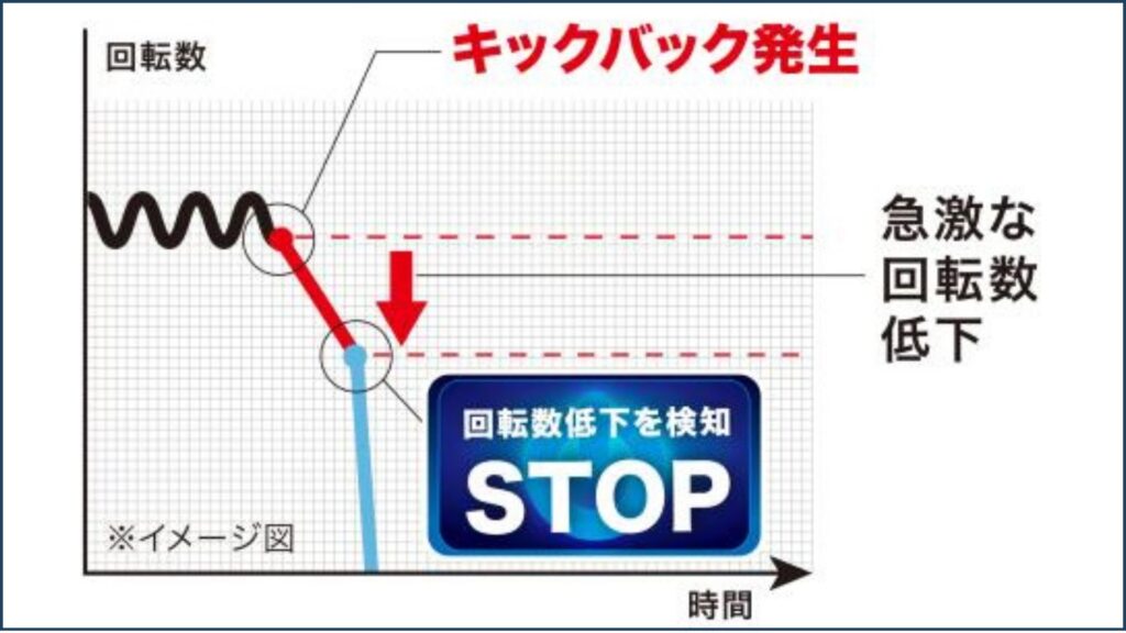 キックバックによる急激な回転数低下を検知し自動で停止させるため、事故の衝撃を抑えて操作者の安全を守ります。