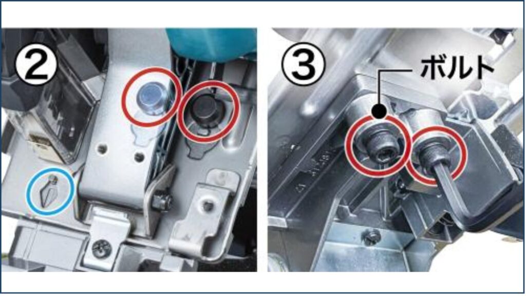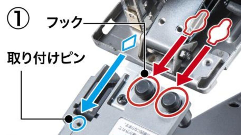 フックと取り付けピンをベースの穴に差し込み、裏側のボルトを締めるだけで作業が完了するため、工具の着脱にかかる時間を短縮できます。