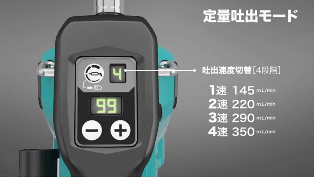 吐出速度は4段階切替が可能。1充電当たりの作業量は以下になります。