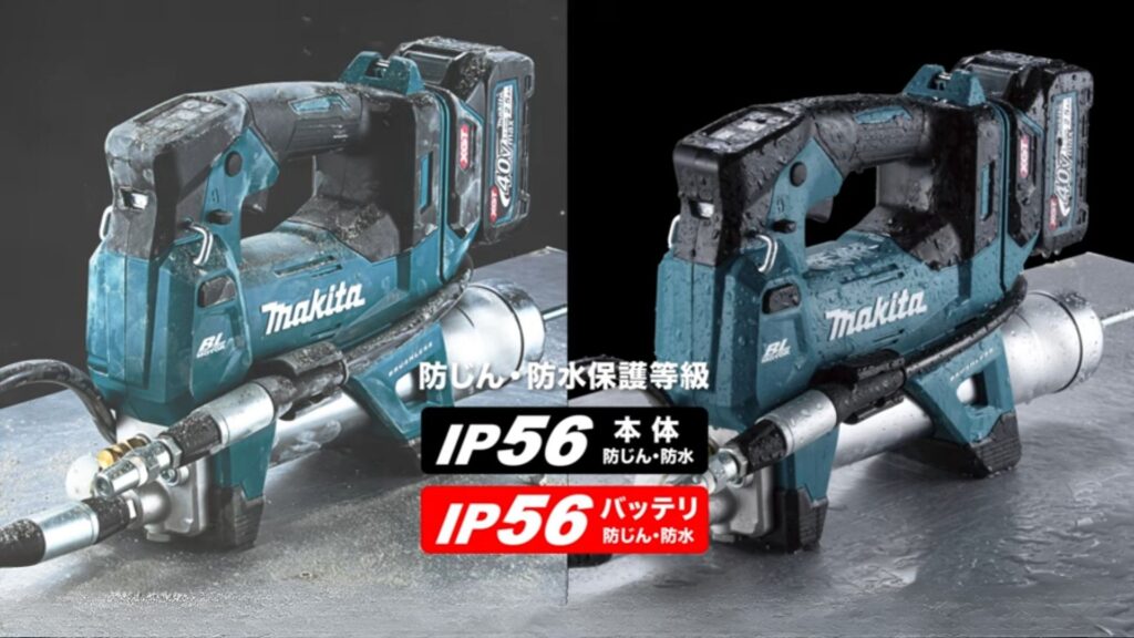 防じん・防水保護等級IP56適合により、電動工具本体、バッテリーともに高耐久となっております。