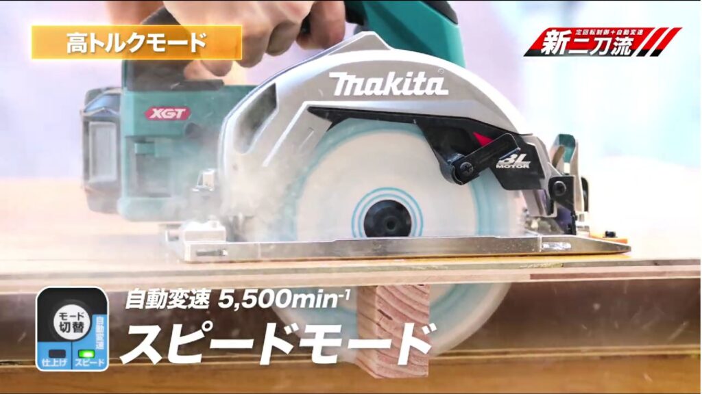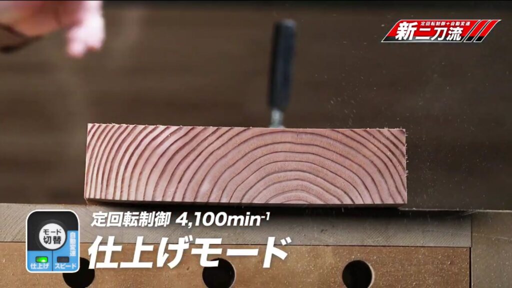 仕上げモードとは切断面のキレイさを重視する機能で、回転数を落とした定回転制御により、硬い木材でも粘り強く切り進めて断面を荒らさない切断が可能です。