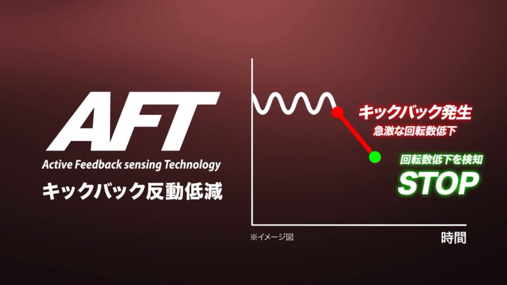 マキタ独自のAFT機能で、キックバック発生と同時に製品を強制的に自動停止して反動をほぼゼロにします。