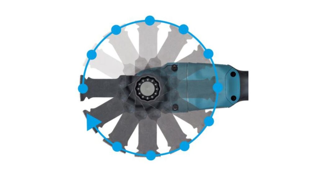 工具取付け角度を30°ごとに360°全方位へ設定できるため、壁際や狭い場所でも最適な向きで効率よく作業を進められます。