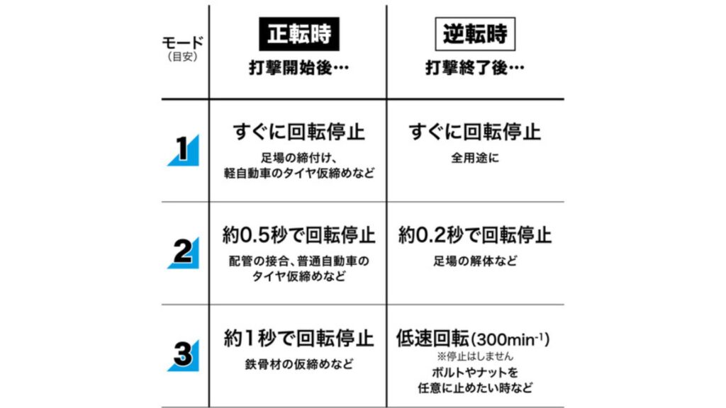 最大モード3では、鉄骨材などの太いボルトに対応し、打撃で強力に固定する必要があるため、打撃後も1秒間は締め続けます。