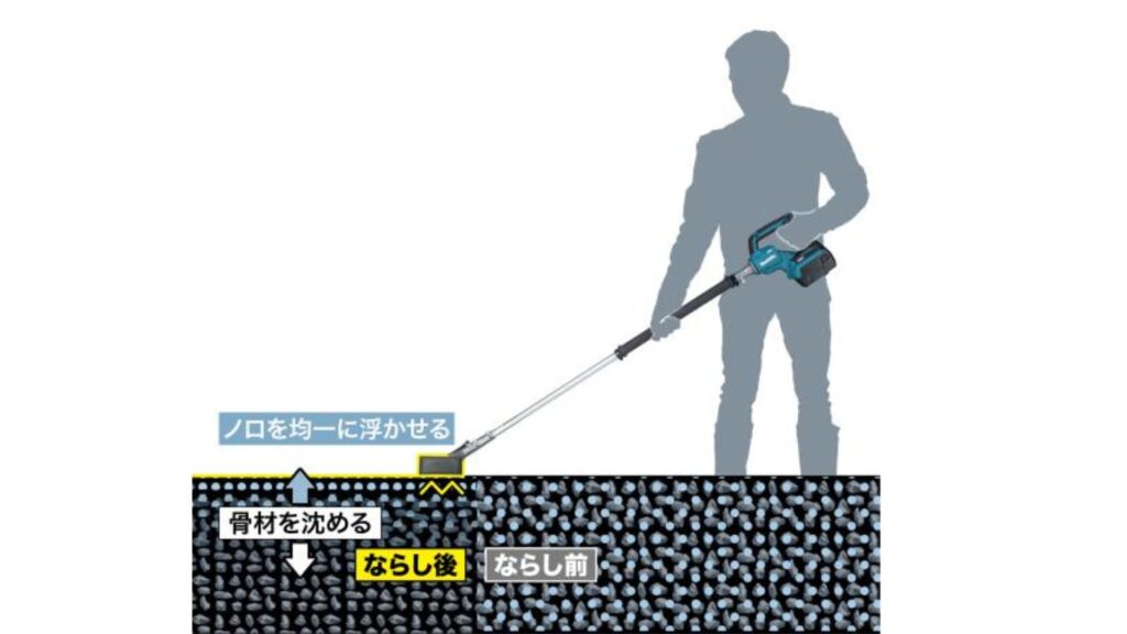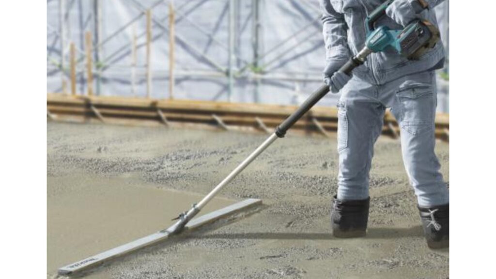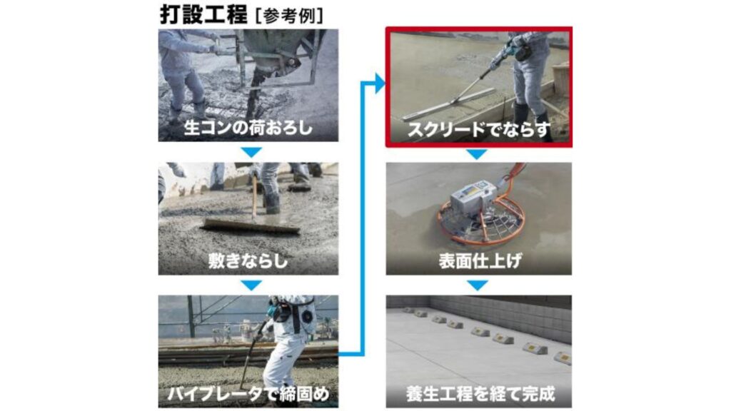 この作業により短時間で均一な厚みを確保できるため、職人の負担を軽減しつつ精度の高い基礎や床面を完成させることが可能です。