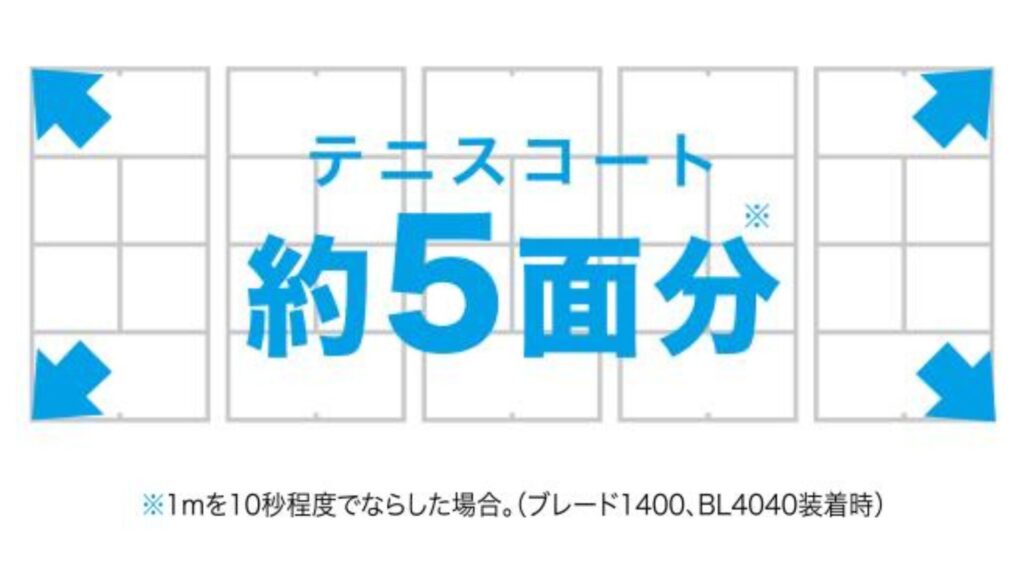 1充電でテニスコート約5面分の面積に対応し、最長約2時間30分の連続運転ができるため、広い現場でもバッテリー切れを気にせず効率よく作業を進められます。