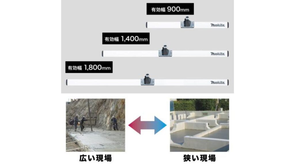 現場の状況に応じて3つのブレード長を使い分けることで、戸建ての基礎といった狭い場所から広い屋外まで効率よく対応できます。