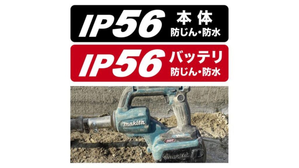 本体だけでなくバッテリも保護等級IP56に対応しており、粉じんや突然の雨の中でも安心して作業を継続できます。